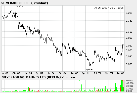 ... sind im Dezember ja doch beträchtliche Summen zu Silverado durch sog. private Investoren geflossen. Zwar wurden Aktien billiger (und manchmal bis zur Hälfte) als der US-Kurs verkauft jedoch ist durch diese Investoren die Zukunft von Silverado wieder langfristig gesichert. (vgl. Informationen auf Yahoo.com)