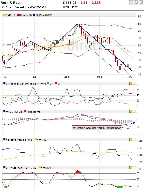 dabei sah es doch bis heute mittag super aus.Aber dann wollten böse Jungs unbedingt die 120€ von unten sehen.Der Tageschart sieht aus,wie von einem Zockerwert.Ich dachte eigentlich bei meinem Einstieg in Roth&Rau an was Solides.z.Z.macht Börse irgendwie nicht so richtig Spaß.Gruß an alle Leidensgenossen.Wilbär.