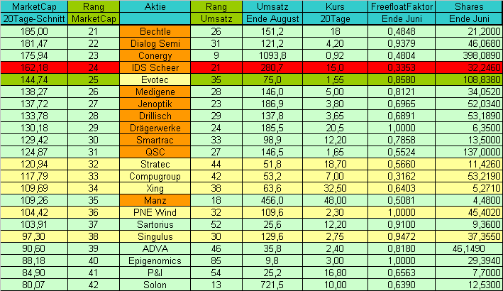 Dahinter muss Evotec auf die gelb gekennzeichneten Aktien achten, aber noch hat man einen guten Vorsprung. Aus meiner Sicht ist zu 90% klar, dass Evotec im Oktober/November in den TecDax kommt. Allerdings dürften das auch die Fondsmanager und Privatanleger schon wissen. Deshalb wohl auch der bereits hohe Kurs bei Evotec.