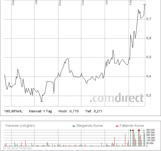 Weg nach oben...die Zwischenpausen dienten nur dem Beistieg neuer Aktionäre und weiter geht es! Ich glaube definitiv, dass wir erst bei 1,50 Euro anhalten werden! Wahnsinn wäre dass...dann machen viele fett Kasse...insbesondere diejenigen, die seit 2010 dabei sind! Wie geil ist das denn!??? 10 Cent rein...jetzt Hebel ACHT und es gibt Dividende...zweimal fünf Cent in 2011 und 2012...Aktie bezahlt...das ist nicht zum aushalten! Die Bashertypen drehen gerade völlig frei...