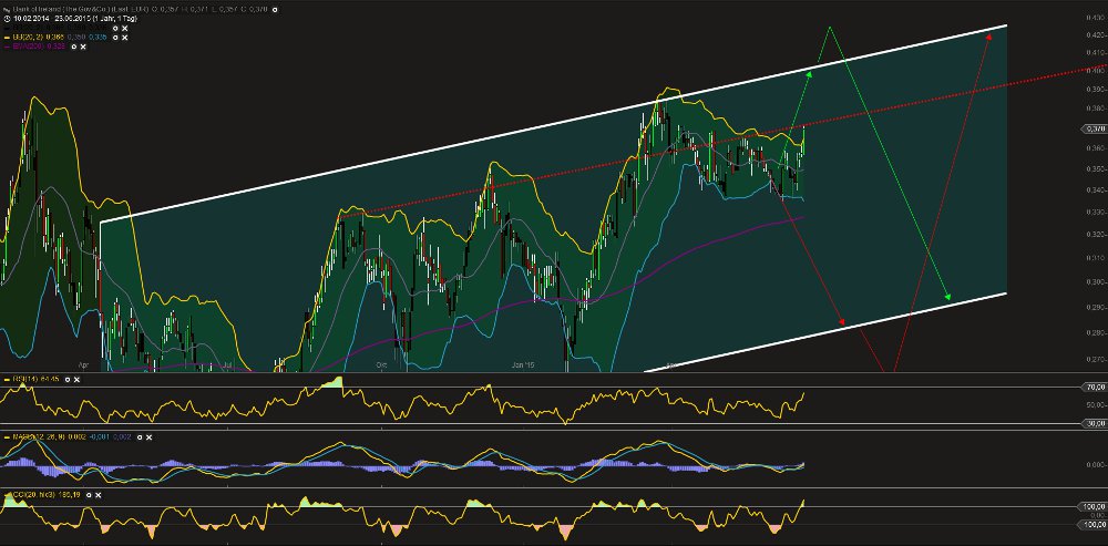 Zu keiner Zeit ist es zu einem nachhaltigen Tageschlusskurs unterhalb der markanten Unterstützungszone bei 0,337 EUR gekommen. Das Resultat dessen waren wieder anziehende Kursnotierungen an die obere Trendbegrenzung, die aktuell von der Bullenseite getestet wird. Ein Ausbruch über das letzte Hoch bei 0,359 EUR dürfte nun zu einem nachhaltigen Kaufsignal führen und das Wertpapier in den Bereich von zunächst 0,369 Euro aufwärts führen können. Darüber rückt auch schon das aktuelle Jahreshoch bei 0,384 EUR den Fokus der Anleger. Übergeordnet wären allerdings sogar Kursgewinne bis in den Bereich von 0,450 EUR denkbar, was sich allerdings im weiteren Verlauf noch zeigen müsste. Abgesichert werden kann eine Long-Position unterhalb der jüngsten Tiefs von 0,335 EUR. Aber erst bei einem Bruch des gleitenden Durchschnitts EMA 200 bei aktuell 0,3263 EUR kann es zu einem Verkaufssignal in Richtung 0,300 EUR kommen. In diesem Bereich können Anleger versuchen eine erneute Stabilisierung sowie Trendwende herbeizuführen....."