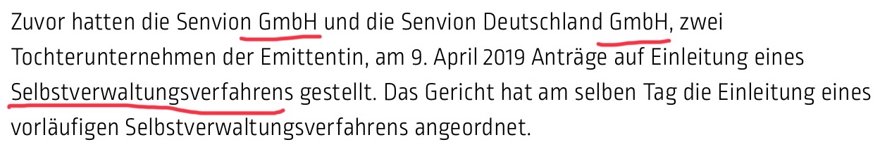 Zuvor hatten die Senvion GmbH und die Senvion Deutschland GmbH, zwei Tochterunternehmen der Emittentin, am 9. April 2019 Anträge auf Eröffnung von Insolvenzverfahren in Eigenverwaltung gestellt. Das Gericht hat taggleich die Einleitung eines vorläufigen Selbstverwaltungsverfahrens angeordnet.