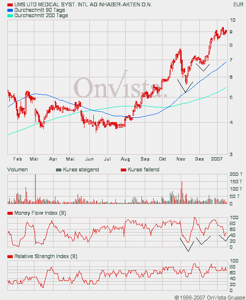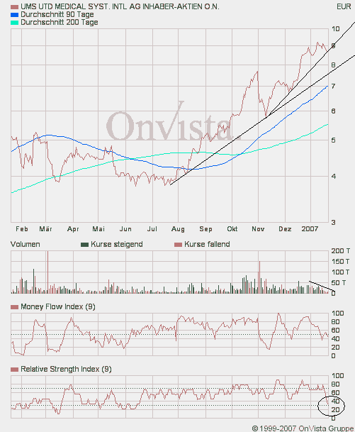 Für Alliance Imaging ergebe sich aktuell ein KGV 07 von 15. Angesichts des zweistelligen Umsatz- und Ergebniswachstums erscheine UMS mit einem KGV (2007) von derzeit 12,4 günstig bewertet. Bei Betrachtung der Industriegruppe Medizintechnik im deutschen Prime Standard würden sich für jene Unternehmen, für die Gewinnschätzungen zur Verfügung stünden (8 von 11 Branchenmitgliedern), ein KGV 07 zwischen 13,4 und 23,7 (Median bei 18,4) ergeben.