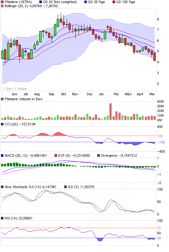 bei Pfleiderer - derzeit scheint mir die Aktie einfach zu schwach - Erholungen finden auch bei positivem Umfeld kaum statt. Wenn es chartechnisch anfängt besser auszusehen und der Abwärtstrend nachhaltig durchbrochen wird steige ich unter Umständen wieder ein.