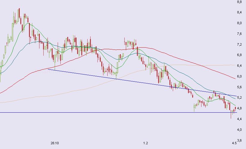 Es sind (mal wieder) alle GD`s durchbrochen, was in Verbindung mit den derzeit volatilen Märkten nichts Gutes bedeuten kann. Fragt sich nur, ob es denn noch schlechter werden könnte. Wenn es gut läuft, sind 4.90 drin, bei guter Nachrichtenlage kommt sogar ein Ausbruch über 5 infrage... also alles noch sehr spekulativ.
