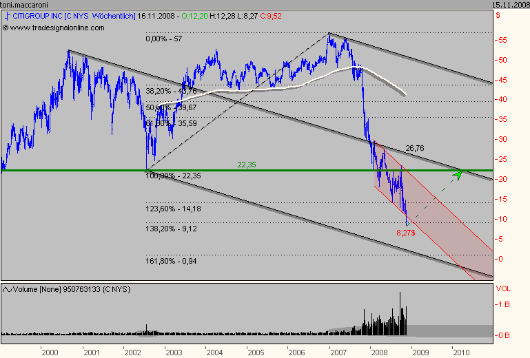 Nö, war in Citi investiert, bin gottseidank vor diesem Kursverfall raus. Die Citi hat schon mehrere Kapitalerhöhungen hinter sich, von den Camels, wie toni gut bemerkt hat, wird sie auch gestützt, aber im Moment geht es erst einmal down. Die Krise ist jetzt so richtig in Fahrt und da würde ich alles andere tun, als in Finanztitel zu investieren. Im Moment nutzen viele Unternehmen die Krise um ihre Leichen aus dem Keller höchst offiziell zu entsorgen, das war in der Vergangenheit auch nicht anders. Mich erinnert das Ganze an 2003 als die NEMAX-Blase platzte. Wir brauchen jetzt konstruktive Maßnahmen der Regierenden und um gottes Willen keinen Staatsbankrott, wie ich gestern schon gefürchtet hatte. 10.000.000.000.000 $ + x sind nicht gerade wenig, auch für die USA nicht. Aber ich sehe heute erstmals Hoffnung für das deutsche Finanzsystem. DAX und Tec-DAX halten erstmals gegen den Trend und schließen wahrscheinlich im Plus. Deutschland in Zukunft treibender Wirtschaftsmotor? Bitte nicht prügeln, nur so 'ne Idee.