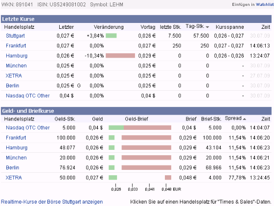 Es hat also von 08:44 Uhr bis 13:24 Uhr über VIER-ein-halb STUNDEN (!) gedauert, bis unsere Plattform endlich gemerkt hat, dass sich in denen Common Shares der Lehman Brothers Holdings Inc. (Akro: LBHI; WKN: 891041; ISIN: US5249081002; Symbol: LEHM oder LEHMQ) überhaupt irgendwas TUT! - Und DAS mit einfachen Timing-Problemen zu verklären, fällt mir nun wirklich sehr SCHWER.