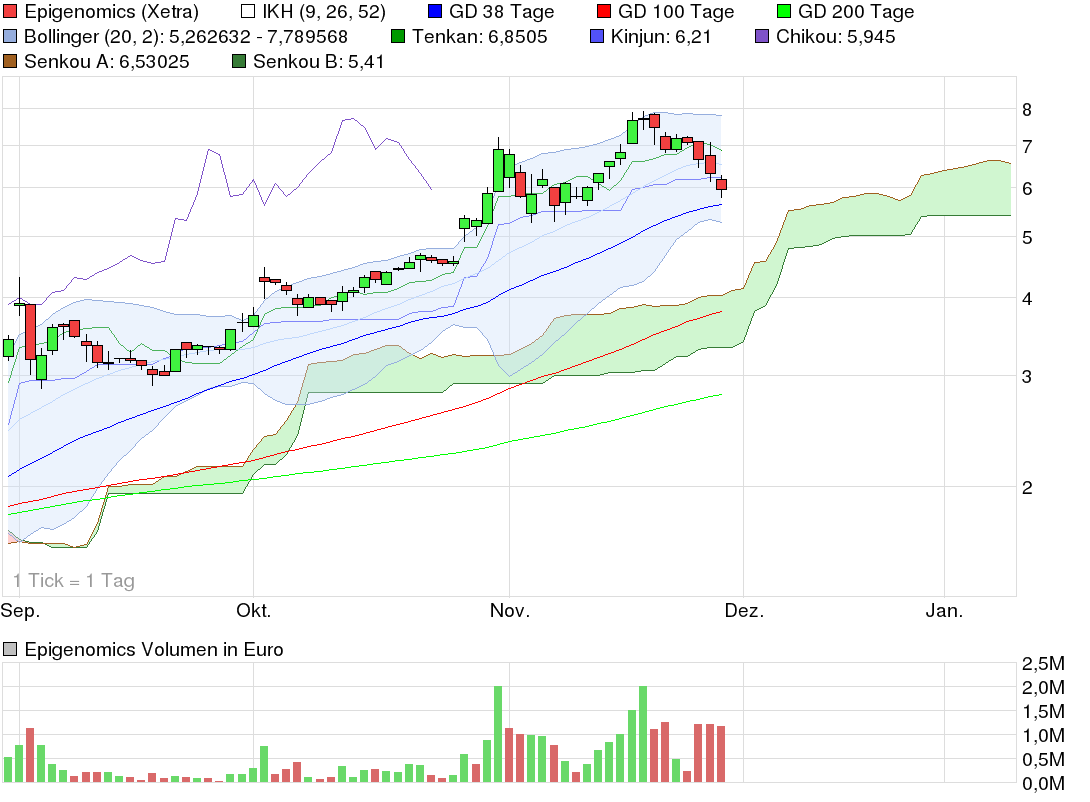 Ich gucke hier schon eine Weile zu und so langsam überzeugt mich die Krebsforschung immer mehr. Der Kurs ist ja dieses Jahr schon sehr stark gelaufen. Ich denke, dass in den nächsten Tagen das untere BollingerBand getestet wird (aktuell bei 5,26). Danach könnte eine Seitwärtsbewegung mit starken Kursausschlägen folgen.