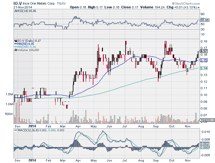 Brien Lundin, in the November, 2014, edition of the Gold Newsletter, refreshes his buy of Inca One Gold Corp. (formerly Inca One Resources Corp.), recently 14 cents. Mr. Lundin said buy in July, 2014, at 17 cents. Assuming a $1,000 investment for the buy, the position is now worth $823. Inca has delivered two 50-tonne-per-day ball mills to its Chala One plant in Peru. Once operational, the mills will bring Chala One's processing capacity to the targeted 100 tpd. In October, Inca secured its first customer, an unnamed government-approved third party miner. Under the deal, Inca will purchase an initial 340 tonnes of ore a month. Mr. Lundin says Inca's goal is to strike similar deals with a variety of small miners and push Chala One to maximum capacity as soon as possible. This is all part of Inca's plan to profit from the Peruvian government's decision to formalize its small-scale mining sector, the editor reminds his readers. He approves of the plan because it is scalable, provides an expansion strategy that requires low capex and ensures cash flow. Being a producer in the current market should also maximize the company's leverage on gold prices when they rise, he adds. Inca remains a buy.