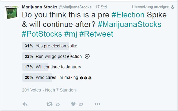 Und da es gerade in Californien mit 60 % Zustimmung blendend aussieht, werden sich jetzt auch zunehmend ernsthafte Investoren mit dem GREEN RUSH beschäftigen.