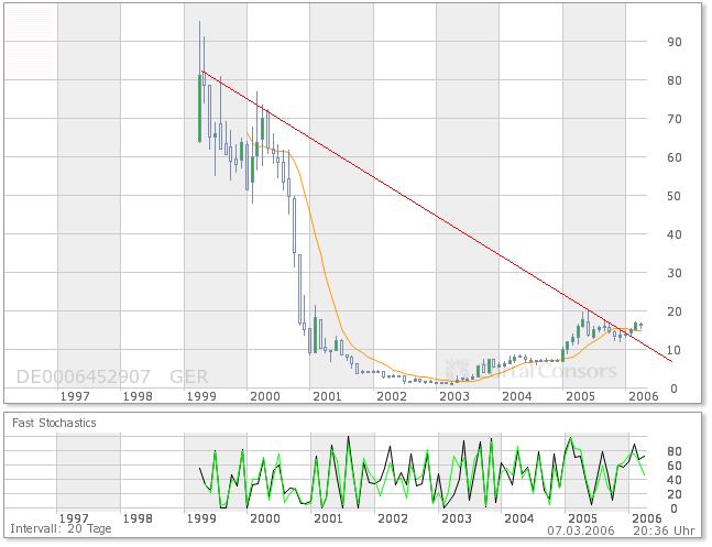 Ich denke, dass der Kurs in einer Range von 15 bis 20 € nicht nur fair bewertet ist, was die zu erwartende­n Gewinne 2006 anbelangt,­ sondern auch dass dieser bereich charttechn­isch Sinn machen würde. Für 2007 erwarte ich sogar höhere Kurse als 20 €. Das ist aber nur meine Meinung.