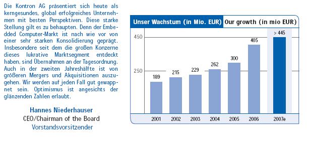 Es sei sehr wahrscheinlich, dass Kontron seine Prognose für 2007 wie in der Vergangenheit übertreffen werde, so Pitz weiter. Angesichts des hohen Auftragsüberhangs und der Erwartungen für das vierte Quartal, werde er seine Prognosen etwas anpassen.