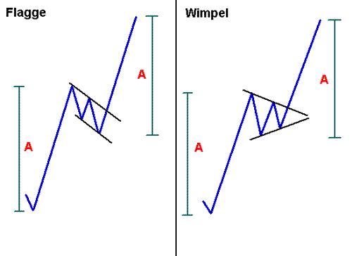 Danach brechen die Kurse nach oben aus (Auflösung des Kursmusters) und legen - laut Lehrbuch - nochmal die gleiche Strecke zurück, die sie seit Beginn der Aufwärtsbewegung bereits bewältigt haben (man sagt, die Flagge weht auf Halbmast).