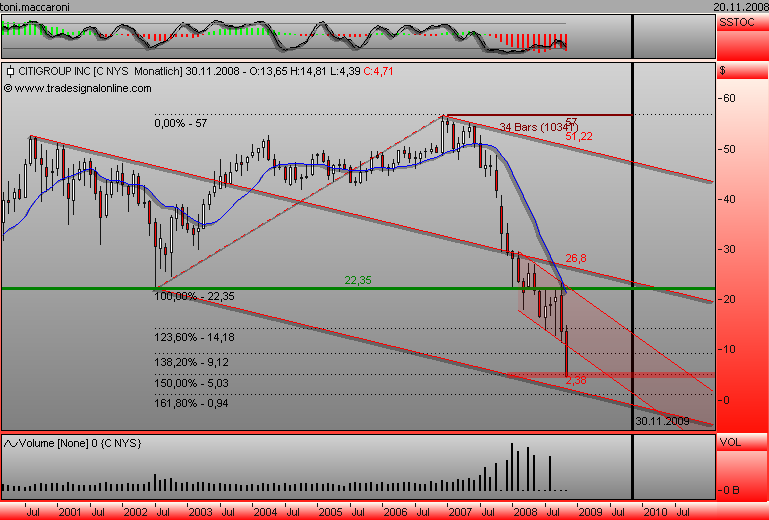 Am 14. hatte ich empfohlen, wegen der Unsummen außerhalb der Bilanz bei Zweckgesellschaften gelagerter Giftpapiere nicht über 5 einzusteigen. Gestern hat CITI mit der Rückführung einer ersten Tranceh von 37 Mrd $ begonnen. Mehr geht offenbar momentan nicht, weil sonst die zu geringe Eigenkapitalquote das Triple A gefährden würde. Sollte sich aber aus dem auch gestern bekannt gewordenen Steuergeschenk von 140 Mrd $ an die US-Banken ein größerer Batzen auch für CITI ergeben, so gibt es bestimmt eine zweite Tranche. Trotzdem werden viele Milliarden Abschreibungsbedarf noch viele Jahre in die Zukunft verschoben werden müssen, sodaß man lange auf Dividendenzahlung wird warten müssen. Fundamental geht es also eher weiter nach unten.