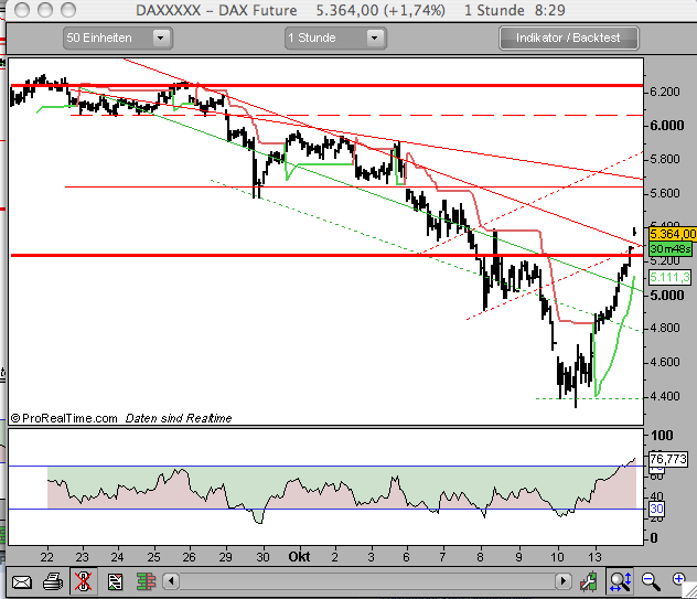 Da wir jetzt 1000 Punkte vom Freitagstief nach oben gelaufen sind, bin ich jetzt mal short gegangen. Sobald auf diesem Niveau schlechte Nachrichten veröffentlich werden, rauschen die Kurse wieder runter. Ferner liegt bei 5350 ein Widerstand. Den SL setzte ich bei 5370.