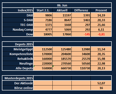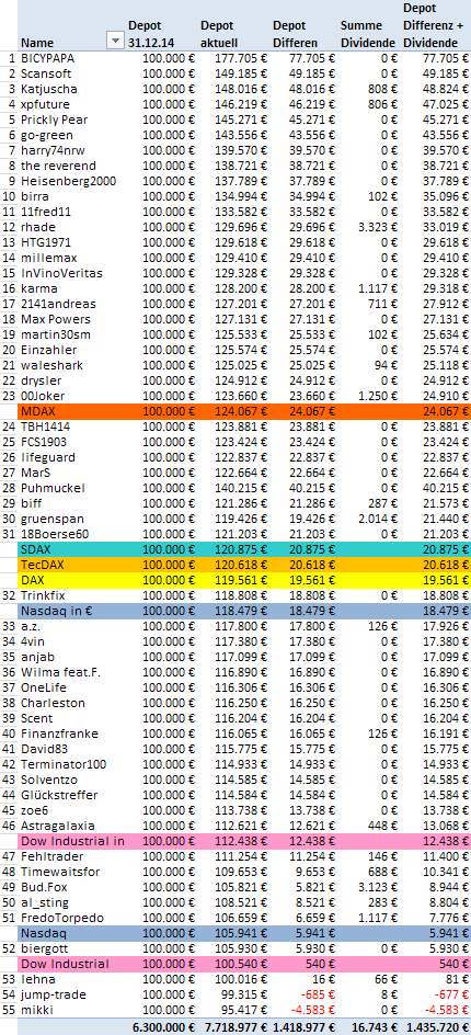 Wie schon vermutet profitieren jetzt etwas die Werte der zweiten und dritten Reihe S-DAX und TEC-DAX sind nahezu unverändert.Die Depots der Neulinge und vor allem des Kompetenzteams können moderat oder sogar stark zulegen. Die Nebenwerte sorgen hier für die Performance. Dennoch hört man schmutzige Bemerkungen der Neulinge in Richtung des Kompetenzteams. Die Neulinge haben in der Statistik die Führung übernommen.