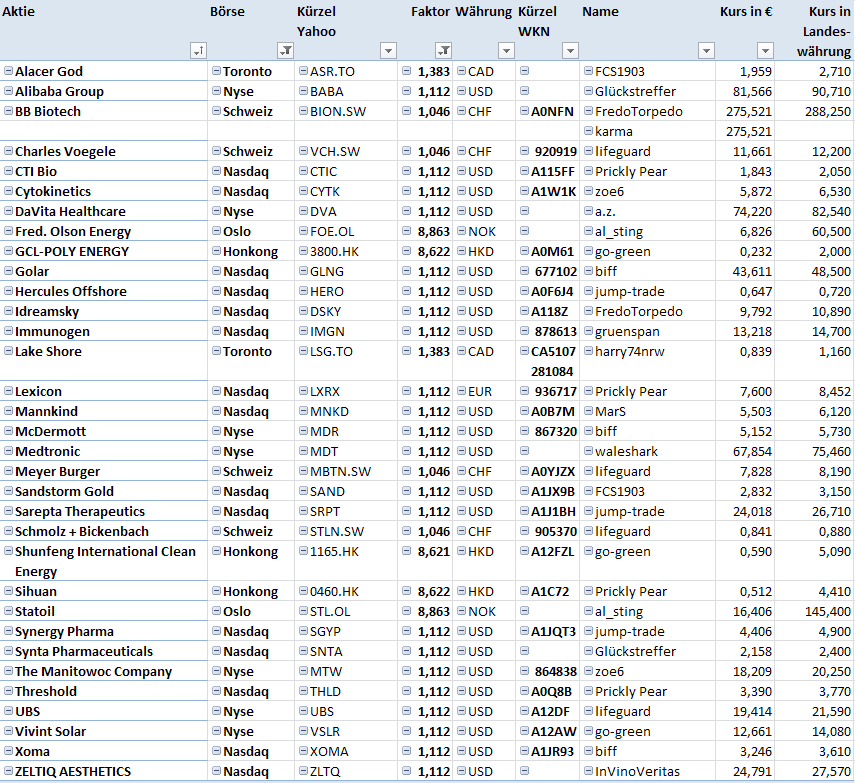 PricklyPear, für deinen Wert Sihuan gab es bei Yahoo den letzten Schlußkurs am 26.03. . Dein Depotwert ist deshalb nur beschränkt aussagekräftig. Vielleicht findest du einen anderen Börsenplatz bei Yahoo, der regelmäßig Kurse liefert. Bei deinem Wert Lexicon habe ich den Börsenplatz von Frankfurt zur Nasdaq geändert.