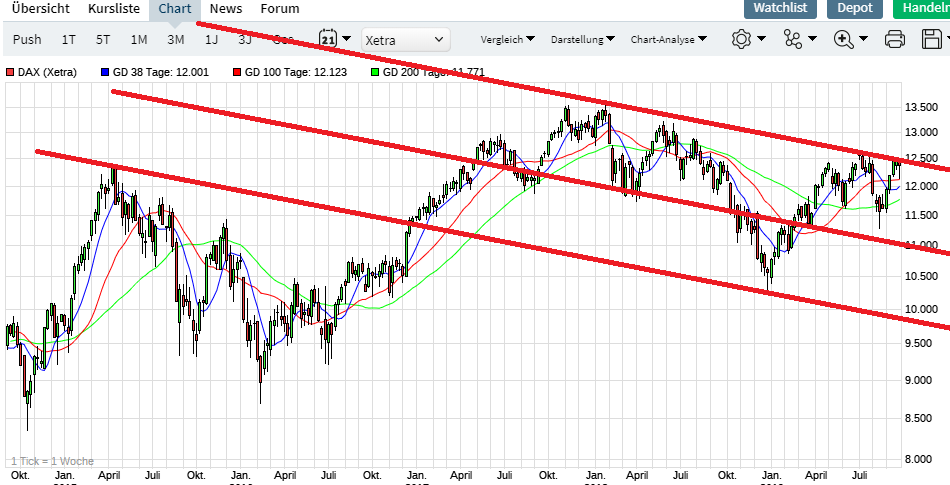 Die alten Trendkanäle sind Geschichte und haben keine Wirkung mehr, das Chartbild muss somit neu angepasst werden. Beim DAX haben wir kein neues Tief gesehen, somit kann er einen neuen Angriff auf die 12500 wagen. Der Bereich ist im Wochenchart mehr als wichtig, da es hier um einen langfristigen Trendkanal geht. Wenn der überwunden werden kann, ist der Weg frei Richtung 13000.