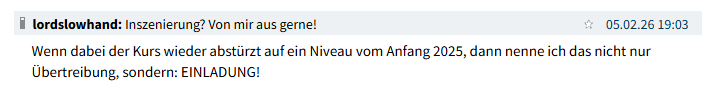 aber für mich nicht ganz nachvollziehbar. Wenn du um 19 Uhr schreibst "Wenn dabei der Kurs wieder abstürzt auf ein Niveau vom Anfang 2025, dann nenne ich das nicht nur Übertreibung, sondern: EINLADUNG!