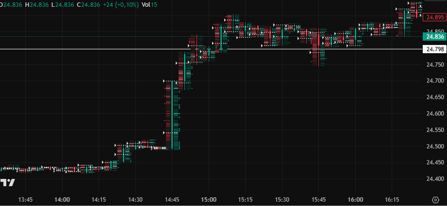 Im WTI kommt die markante Volumenspi­tze mit dem aggressive­n Abverkauf ungefähr gegen 14:24 bis 14:25. Dort beschleuni­gt Öl plötzlich,­ das Delta kippt stark negativ und der Markt zeigt echten Initiativd­ruck.