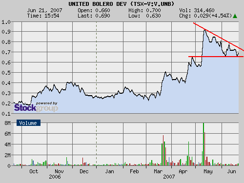 "....unser Musterdepotwert United Bolero fällt heute ziemlich stark. Dies hat aber mit der fundamentalen Situation nichts zu tun. Wir denken, dass dieser Kursverfall technisch bedingt ist. Da der Aufwärtstrend gebrochen wurde, sind hier einige Stoppkurse im System ausgelöst worden. Sie wissen selbst, dass Pinetree Capital LTD. hier immer wieder Stücke kauft und die werden das nicht tun, wenn Sie hier kein Potenzial sehen würden.