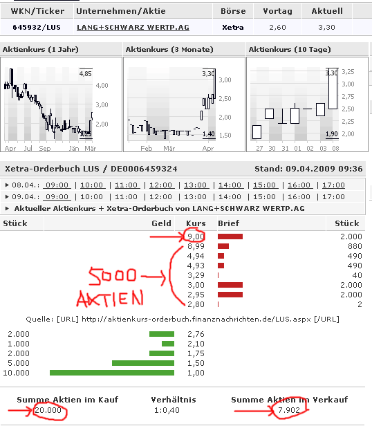 5. Wenig Handel: Spread sehr groß(Abgesehen von den 5000 PufferAktien - Xetra 3,-bid - 10,-ask