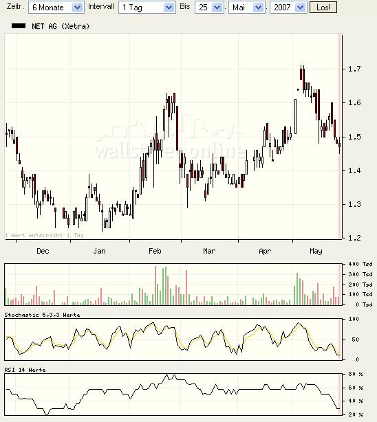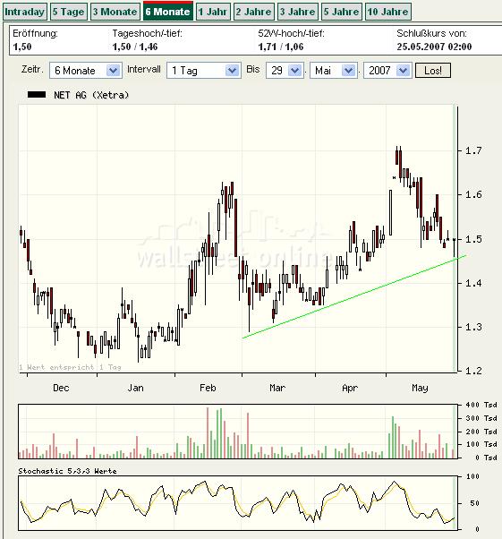 Das dumme ist, das die net oft eine Sonderkonjunktur hat, was den Kurs betrifft. In Zeiten des steigenden Marktes steigt sie oft nicht, bzw. korrigiert schon wieder. Bei Marktkorrekturen fällt sie aber meistens dann doch mit. Unvorteilhafterweise könnten die Märkte grade jetz ein bisschen korrigieren. Da bleibts abzuwarten, wenns denn so kommt, wie unsere net darauf reagiert. Erstmal hat sich die letzten Tage aber bei 1,49 eine leichte Unterstützung ausgebildet..