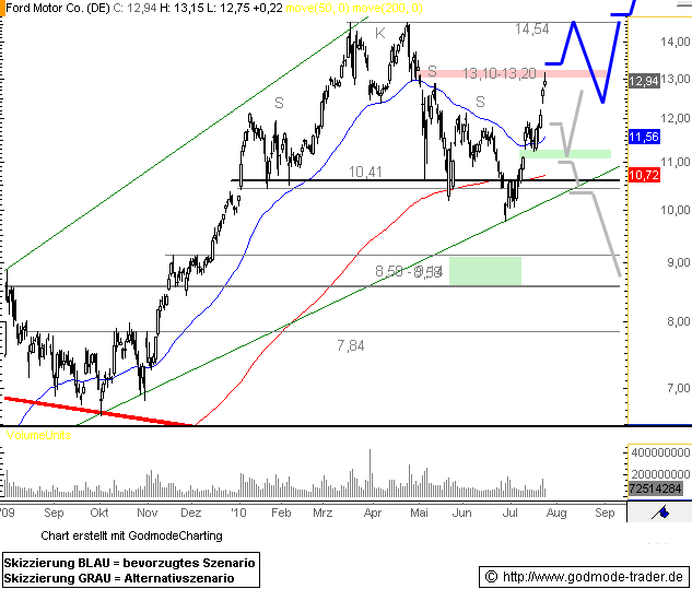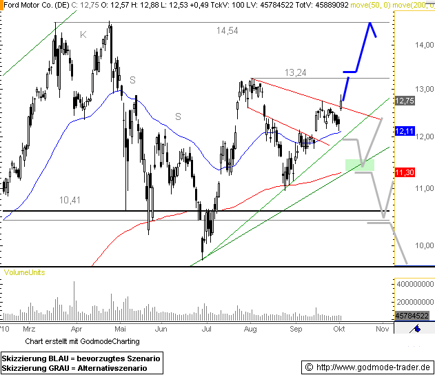 Sehr stark präsentiert sich am heutigen Tag die Ford Aktie, welche aus dem Konsolidierungsmuster der vergangenen Tage nach oben herausspringt und über 4 % an Wert gewinnt. Ein Anstieg zum Widerstandsbereich bei 13,10 - 13,20 $ sollte nun folgen. Geht es wieder nachhaltig über 13,25 $, wäre das Hoch bei 14,54 $ das nächste Ziel. Darüber hinaus eröffnet sich weiteres Aufwärtspotenzial bis ca. 22,00 - 24,00 $.