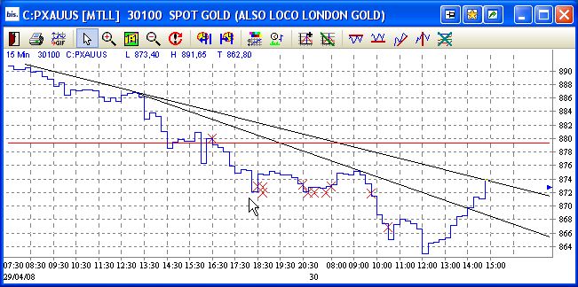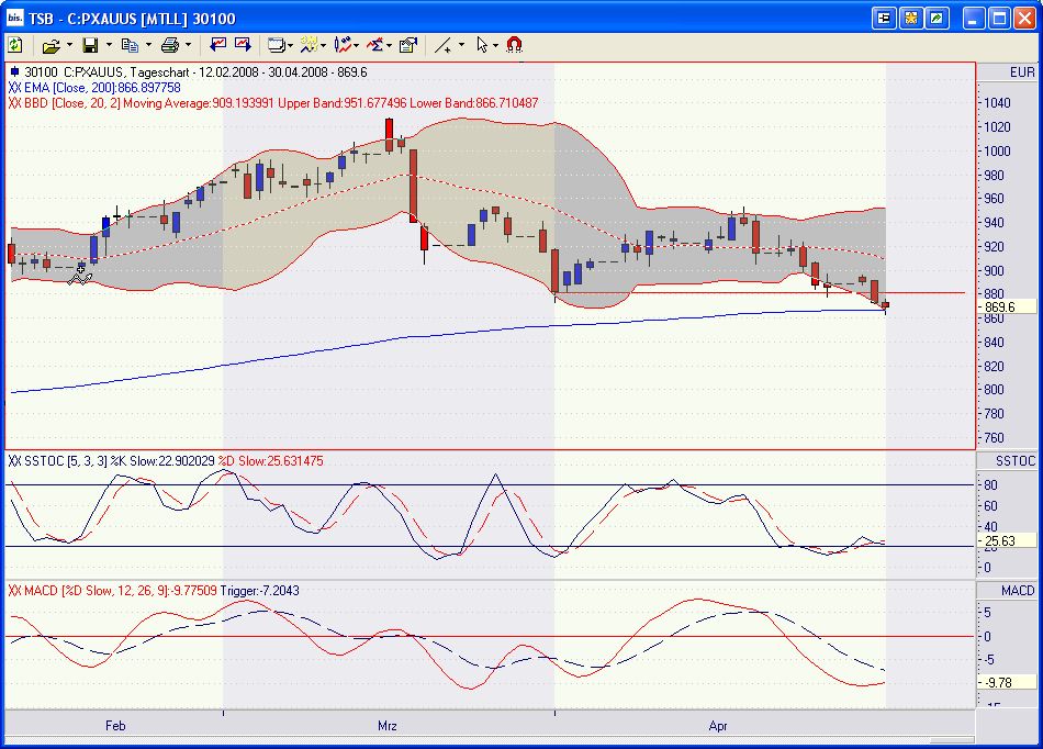 Diagnose: Seit gut zwei Wochen läuft nun die längst überfällige Konsolidierung beim Future auf den Goldpreis, der Mitte März auf ein Rekordlevel bei 1033,90 US-Dollar je Feinunze (31,10 Gramm) angestiegen war. So etablierte sich in den vergangenen Tagen ein Abwärtstrendkanal, der am Montag dieser Woche auch den seit Sommer 2007 bestehenden Aufwärtstrend nach unten durchbrach.