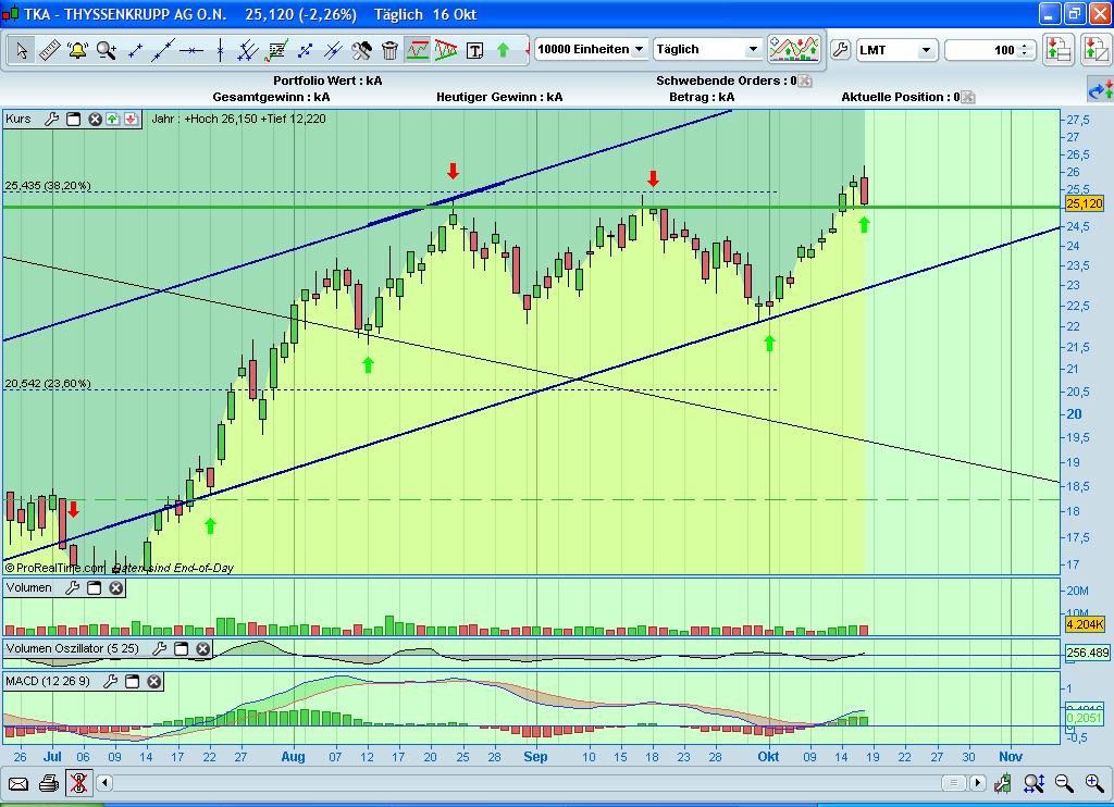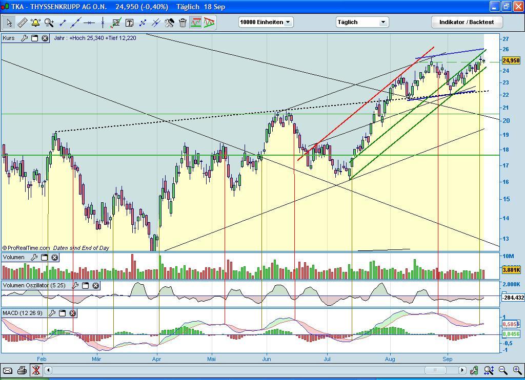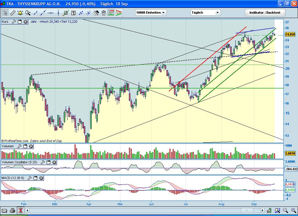Noch ein kleiner Chart zur Thyssen Aktie. Der oben bereits gezeigte Trebd konnte sich weiterhin etablieren und wir steuern immer mehr auf seinen oberen Rand zu. Nach unten wirkt der Bereich zwischen 23 und 24,50 Euro als starker SP - nach oben ab 25,30 ein Widerstand, der nächst großere im Bereich um 26 (siehe Chart).