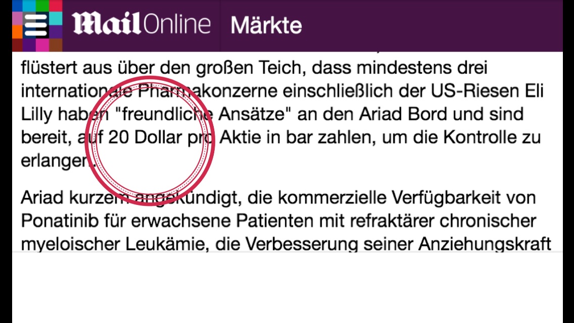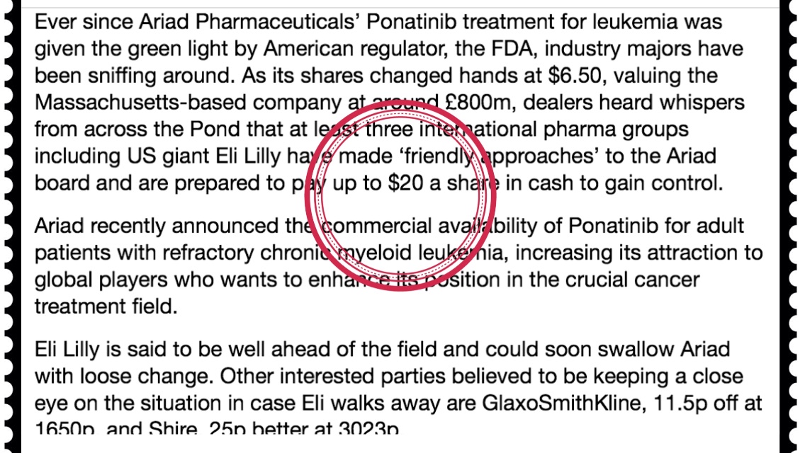 Ariad Pharmaceuticals ( ARIA ) Aktien Spike 4,3% AH, nachdem der Daily Mail schwebt ein Gerücht, dass die Industrie-Majors wie Eli Lilly, Glaxosmithkline und Shire "wurden um Sniffing" seit Iclusig wurde grünes Licht gegeben durch die FDA.
