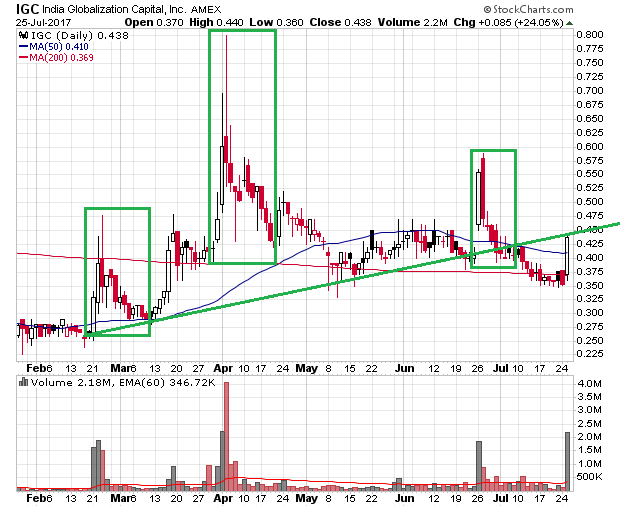 Wie schon gewarnt, ist IGC eine äußerst marktenge Aktie (Gesamtumsätze unter 60k USD an manchen Tagen!), Der Aktienkurs kann man mit einem (Multi-) (Day-)Trading-Einsatz von wenigen 100k USD nach Belieben entweder 20% nach oben oder 20% nach unten verschoben werden.