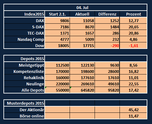 Zwischen-Tops beim Griechenland-Chaos ein paar Urlaubstage eingelegt ohne Lap-Top und Excel und auch ohne Zugang zu meinen Depots. So komme in nicht in Versuchung aus Nervosität unnötig zu verkaufen. Mein Investitionsgrad liegt nach wie vor über 80%, da ich überzeugt bin, das Griechenland keine Nachhaltige Trendwende an den Aktienmärkten bewirken wird.