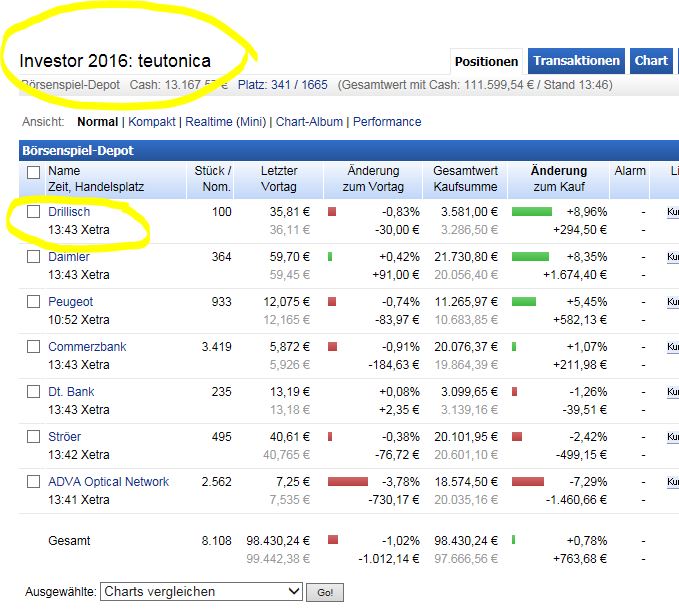 Lol. Das ist mein Arivadepot und Dein Eindruck eine Momentaufnahme. Ich darf bei ariva nur 10 mal im Monat kaufen und daher ist Deine Einschätzung nicht realistisch. Durch die limitierten Käufe ist mein Kaufverhalten beim Börsenspiel ganz anders. Zum traden ist Drillisch natürlich prima. Ich habe das hier im Thread auch schon einige male beschrieben und kein Geheimnis daraus gemacht. Blätter einfach mal einige Seiten zurück... Kurz rein und schnell wider raus. Früher habe ich Drillisch für 42 Euro gekauft und bin dann eins, zwei Euro hochgefahren und habe dann verkauft. Heute kaufe ich Drillisch bei 33 bis 35,50 und fahre hoch bis maximal 37 Euro...Lol. Langfristig würde ich Drillisch nicht halten. Selbst im Arivadepot habe ich Drillisch nur seit kurzem und bei 37 Euro geht sie spätestens raus. Schon ein Unterschied. Die longis von Drillisch haben schon vor langer Zeit gesagt" warte die zweite Jahreshälfte ab...Dann: warte den April/Mai ab...Lol. Die Aktie fällt und es ist kein Wunder. Es gibt genügend gute Alternativen wie S&T, Stroer u.s.w. Aber soll jeder machen...