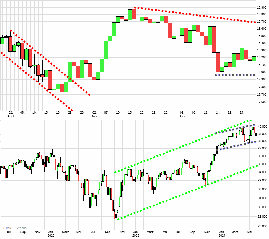 Bei 18100 Pkt liegt derzeit der Längerfris­tige aufwärtstr­end seit Februar 2024.