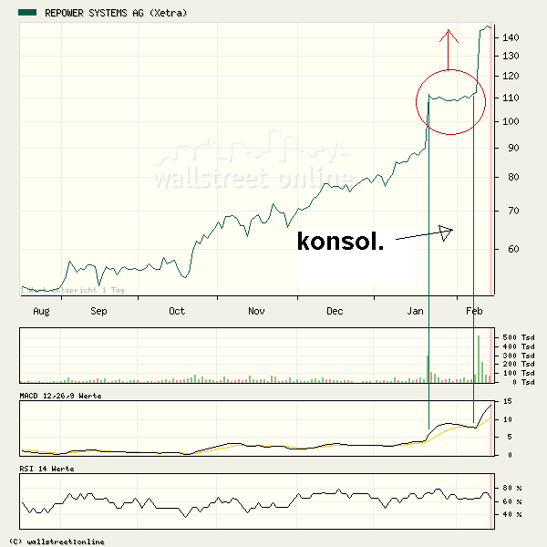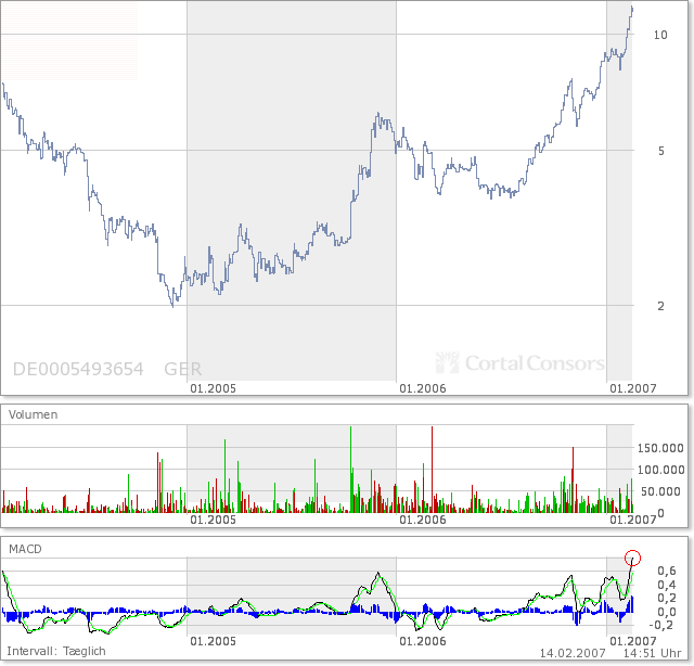 richt nach Konsi...wenns so steil geht wie im November: 9 - 9,50 €. Bei halbem Aufwaertstrend (gruene Linie) sind wir naechste Woche bei 10 - 10,50 €. Indikatoren sind sich fast am "rueckwaerts ueberschlagen", ausserdem stehen wohl die 2006er Zahlen bald an. Ich "sell" lieber "before good news" ;))