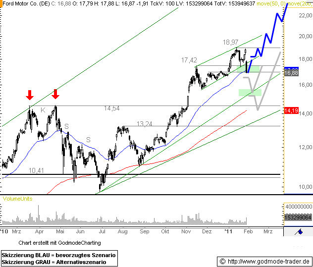Die Ford Aktie erreichte gestern beinahe noch das Jahreshoch bei 18,97 $, heute bricht der Kurs nach den Zahlen um über 10 % ein. Noch ist ein bullisches Szenario vertretbar, die Aktie setzt an den Unterstützungsbereich bei 16,60 - 17,07 $ zurück. Hier müsste nun ein Reversal gelingen heute oder am Montag, um den Beginn einer größeren Abwärtskorrektur zu verhindern. Dreht die Aktie und steigt anschließend über 18,00 $ an, können das Hoch bei 18,97 und darüber hinaus der Bereich bei 22,20 und 23,50 - 24,00 $ erreicht werden.