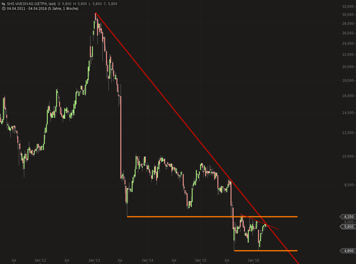 Im Weekly sieht man ganz klar die Bodenbildung mit dem Doppeltief im Bereich 4,8€. Man kann auch ganz gut die Abwärtstrends und markante Hochs oder Tiefs erkennen.