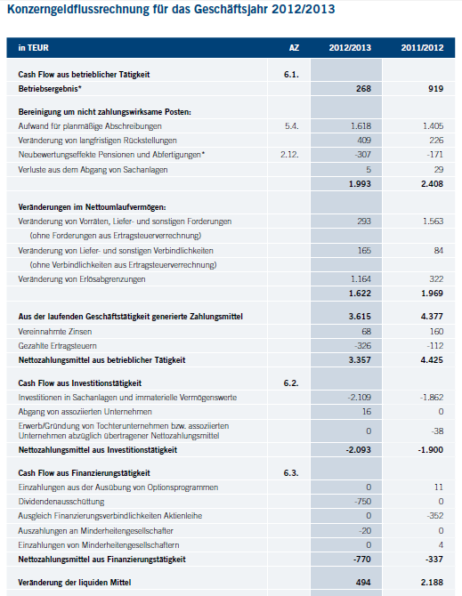 Und Fakt ist, wir hatten im vorletzten und letzten Geschäftsjahr jeweils einen positiven Nettocashflow, obwohl der CF aus Finanzierungstätigkeit negativ war. Die liquiden Mittel stiegen deshalb von 12,45 Mio € um 2,7 Mio € auf 15,15 Mio € obwohl die beiden Nettogewinn der beiden Jahre zusammen nur bei knapp 1,1 Mio € lag.