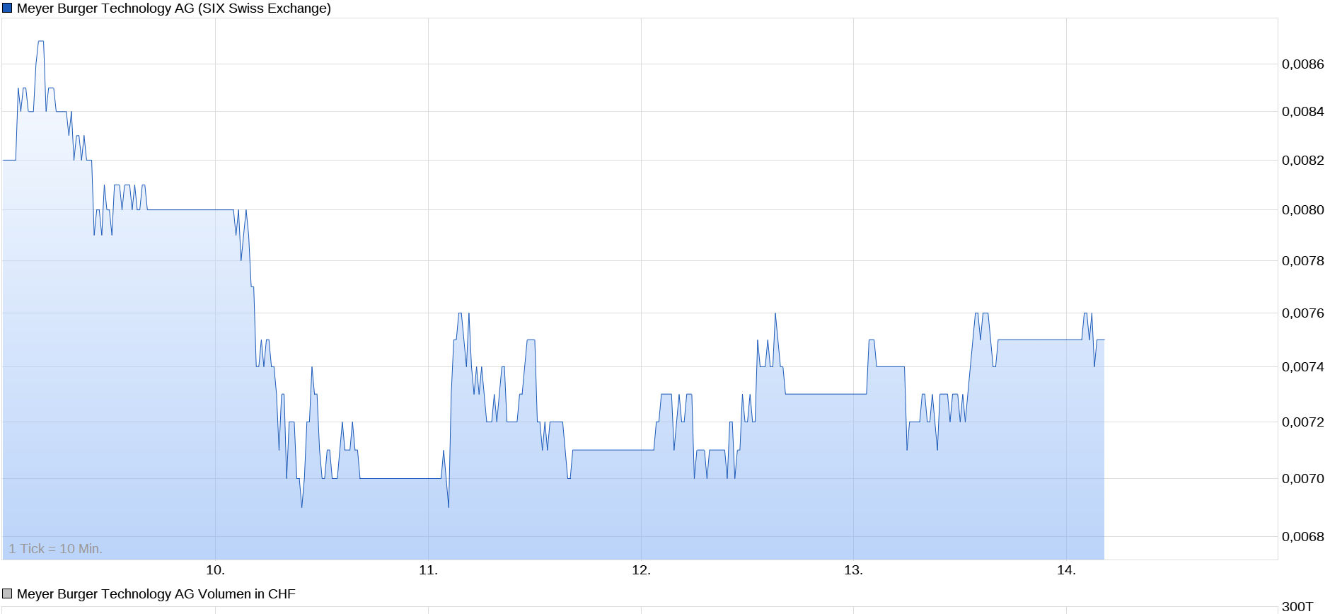 Wenn ich mir den Einjahres-Chart ansehe, gibt es schöne Widerstandlinien bei CHF 0,05, CHF 0,10, CHF 0,15 und CHF 0,20.