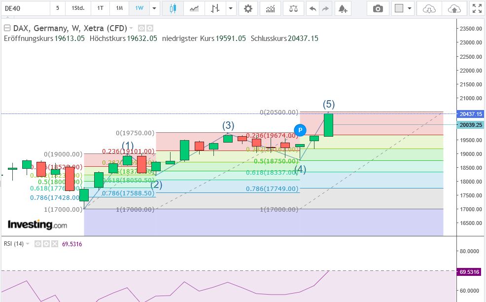 Wäre das plausibel? Ich habe mal im Wochenchar­t etwas herumgemal­t. Sähe für mich nach einem sehr sauber abgearbeit­eten 5-Weller aus, oder nicht? Ein bisschen Luft wäre demnach noch... Zwischen den Hoch (etwas gerundet) lägen dann immer 750 Punkte. 20500 ist lauf Analysten auch das Basisszena­rio, auf das gewettet wurde. Nun sieht der RSI aber schon sehr überkauft aus. Der VDax liegt auf 13,xx. Was haltet ihr von der Interpreta­tion? Was sagen die Perlenkett­en?