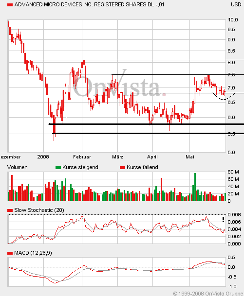 Die aktuellen Probleme überschatten dies jedoch. Ich hab zurzeit keine AMD-Aktien. Würde auch erst nach einer deutlichen Korrektur des Gesamtmarktes (bzw. des Nasdaq) in Tech-Aktien investieren. Der Nasdaq könnte im Zuge der US-Rezession bis 2010 noch 30 bis 50 % nachgeben. Man kann daher in Ruhe abwarten, ob es AMD dann überhaupt noch gibt ;-)