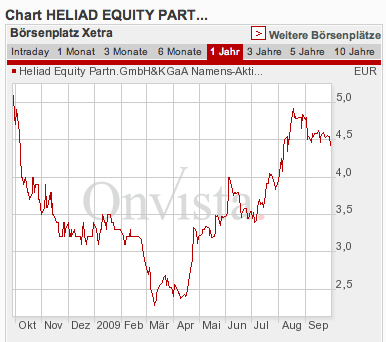 So habe Heliad Equity Partners für das zweite Quartal 2009 wieder einen Nettogewinn von 2,3 Mio. Euro erzielt. Damit könnte für das Gesamtjahr 2009 ebenfalls ein Nettogewinn ausgewiesen werden. Die Analysten von CB Seydler würden für 2011 einen Gewinn je Aktie von 2,30 Euro prognostizieren, womit das KGV 2010e von 3 in 2011e auf 1,9 sinke.