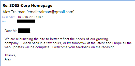 Klar der Internetauftritt ist auch als Visitenkarte eines Unternehmens zu werten, aber gar so ausschlaggebend wie madold würde ich es nicht bewerten, obwohl ich zweifelsohne auch der Ansicht bin, je professioneller der Auftritt gestaltet wird, um so eher hält er die Aufmerksamkeit wach, die allerdings schon vor dem ersten Besuch auf der Internetseite geweckt werden muss, und da stellt sich auch die Frage, wie mache ich mich bekannt, damit potentielle Interessenten überhaupt erst auf die Idee kommen die SDSS - Seite zu besuchen.