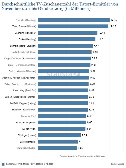 Erschreckend die Grafik: Der mit Abstand schlechteste Darsteller ganz oben. Natürlich wegen der Medien-Werbetrommel, ohne die kein Tatort auskommt. Dass sie gerade beim Tschiller-Schrott Vollgas gab, sagt mehr über unsere Medienlandschaft als über die Zuschauer. Nach der nächsten Baller-Folge aus Hamburg dürfte er sich im Mittelfeld wiederfinden.