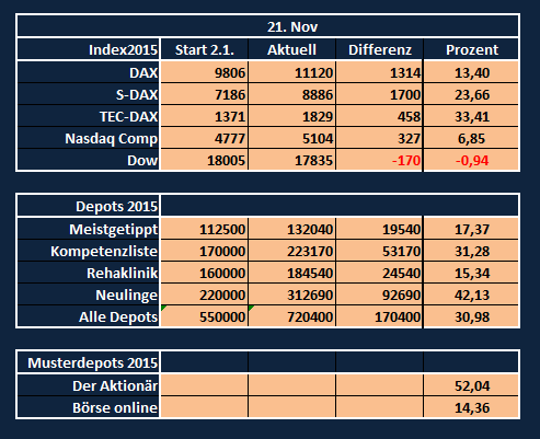 Unsere Depots legen im Schnitt 13% zu. Den Vogel hier schießen die Neulinge ab. Eine sagenhafte Performance im November von über 20%.