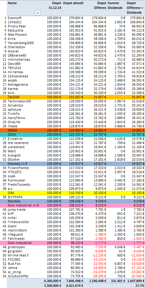 Allerdings sollte es nach meiner Vorstellung wieder ein "Ganzjahresspiel" werden, da das doch den besonderen Reiz ausmacht: Werte auszusuchen, von denen man längerfirstig erwartet, dass sie gut laufen. Und wenn man die Spiele in den letzten Jahren verfolgt hat, klappt das bei mehreren Teilnehmern sehr gut.