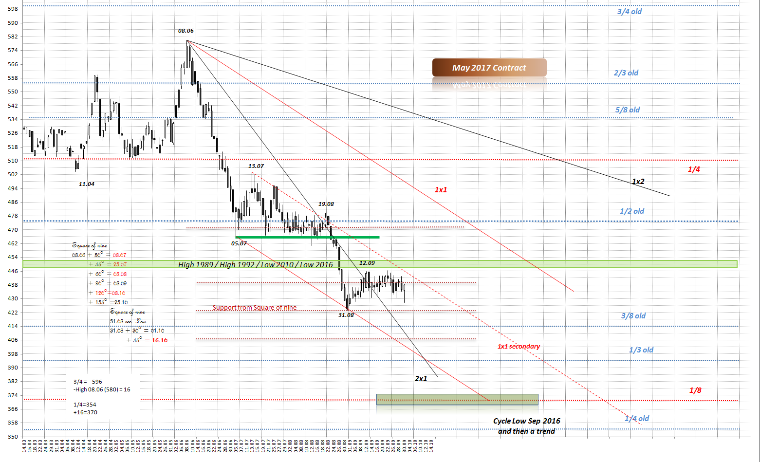 Ich habe noch mit Square of nine - Analyse des Preiszyklen ermittelt. Am 31.08 schloss Weizenpreis Zyklus ab, ohne weitere Ziele nach unten zu aktivieren.