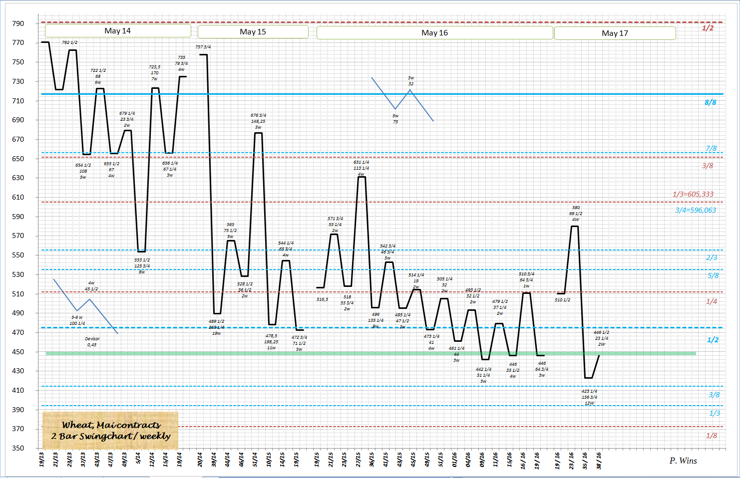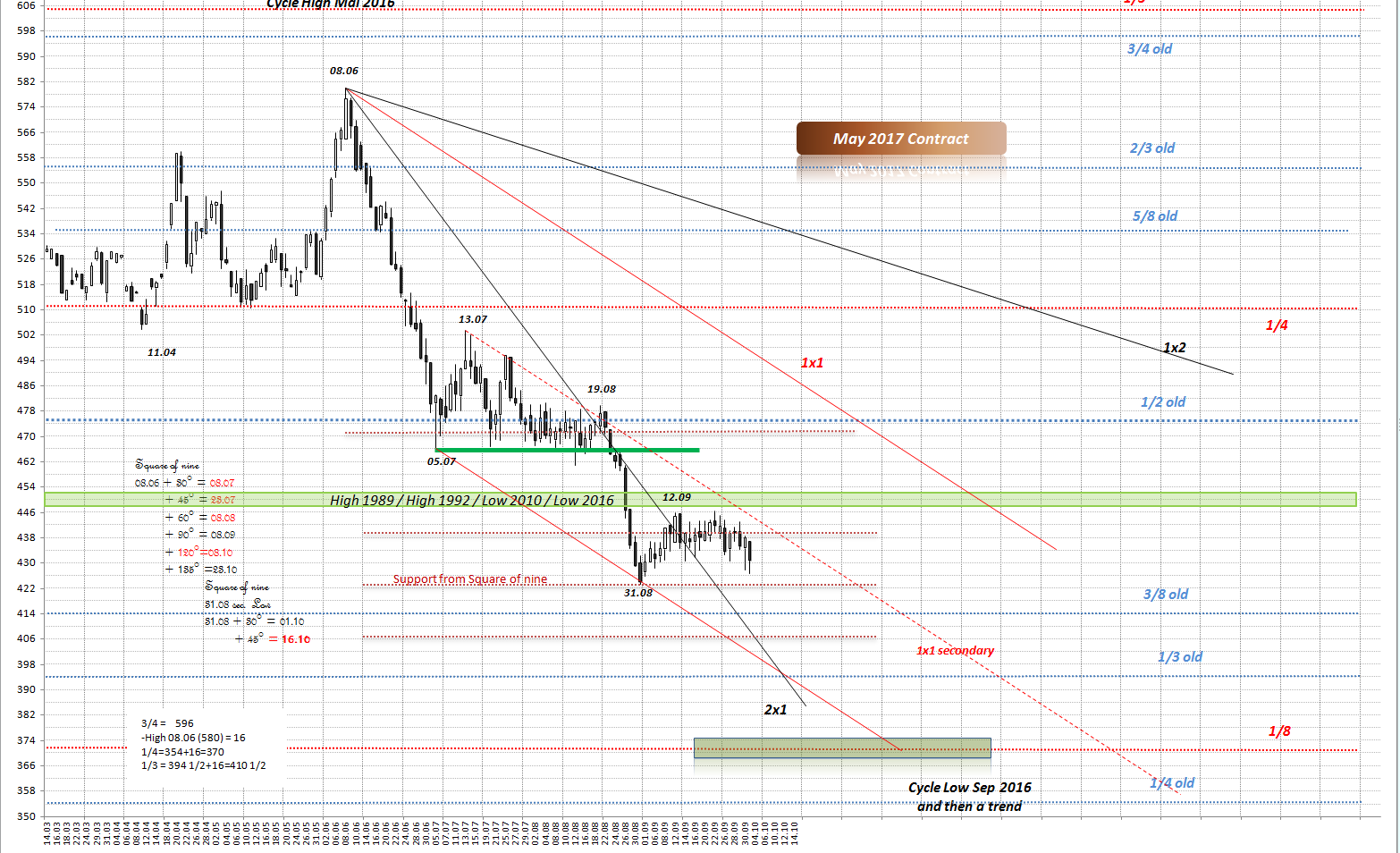 Nächste Unterstützung in der Zeit müsste um den 08.10 kommen. Spätenstens da werde ich mich von der Short Position trennen, SL liegt seit heute bei 445 US Cent, Mai 17 Kontrakt. Bei ausstoppen der Short Posi - wird Long Posi eingegangen.