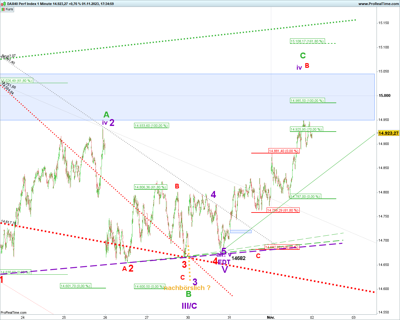 Auch gestern blieb dem DAX ein Anstieg über 14831 versagt und zwar gleich zweimal bei 14829. Schafft er heute (vorbörslich 14882) die 14831, dann dürfte das Tief (5-EDT) bei 14682 gelegen haben und die 3-EDT war - wie schon gestern und vorgestern deutlich gemacht - das nachbörsliche Tief um die 14600 am Montag. Alle Bedingungen eines EDT wurden erfüllt und theoretisches Ziel sind jetzt die 15576, der Beginn des EDT's. "Holperig" sollte es erst über 14900 werden, denn dann hätte die 2. Welle ab 14682 schon 100% erreicht und könnte seitwärts Richtung AUT laufen.